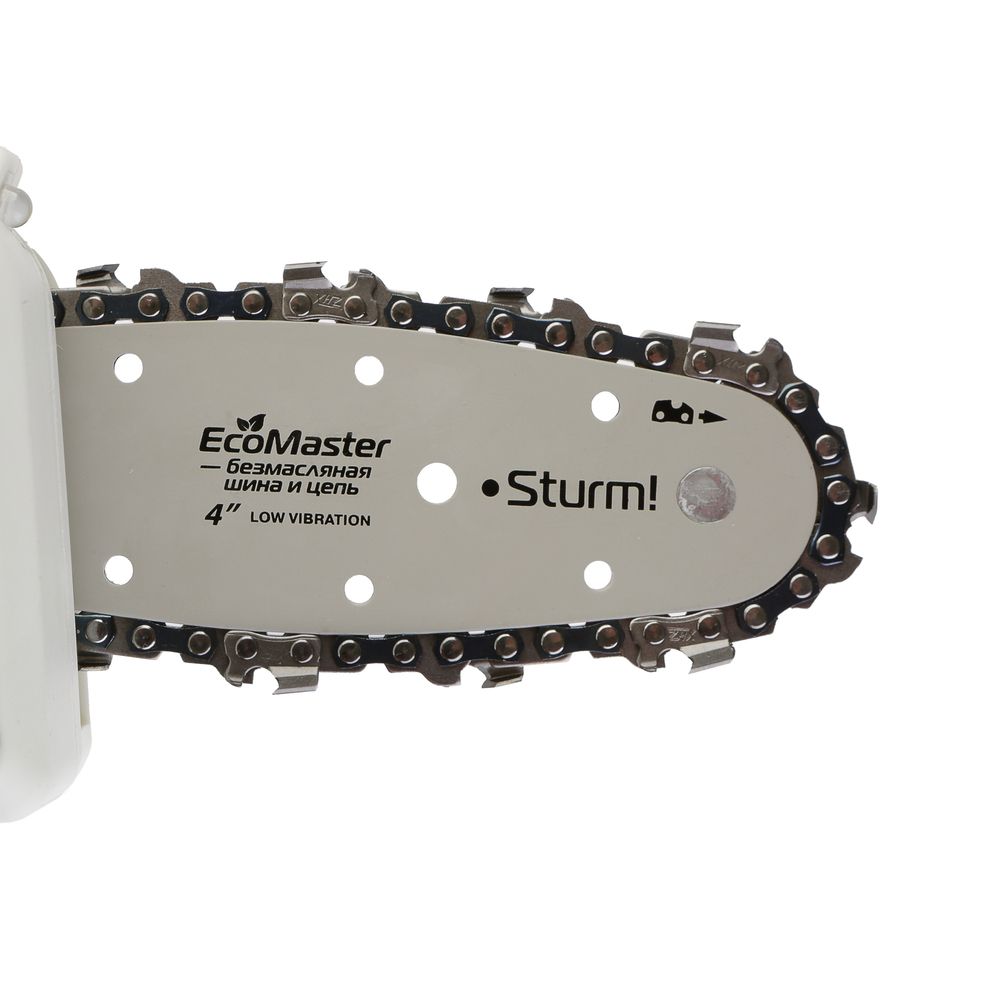 Аккумуляторная пила CSC1204 Sturm! Предназначена для бытового использования. Данная модель обладает повышенной мобильностью, так как может использоваться вне зависимости от источников питания. Идеально подходит для работы в саду при уходе за растущими деревьями, распила и обрезания веток деревьев, а также справится с простыми столярными работами. Главной особенностью цепной пилы является наличие безмасляной пильной гарнитуры. Это гарантирует немало преимуществ: пила не нуждается в заправке маслом и, как следствие, в постоянном контроле его уровня, исключается необходимость регулярной прочистки маслоподающего канала от опилок, инструмент не оставляет масляные пятна при транспортировке или хранении. Откидной защитный кожух делает работу с пилой безопасной. При необходимости можно задействовать всю длину шины, кожух откидывается под углом 90°. Прорезиненная рукоятка обеспечивает надежный хват.