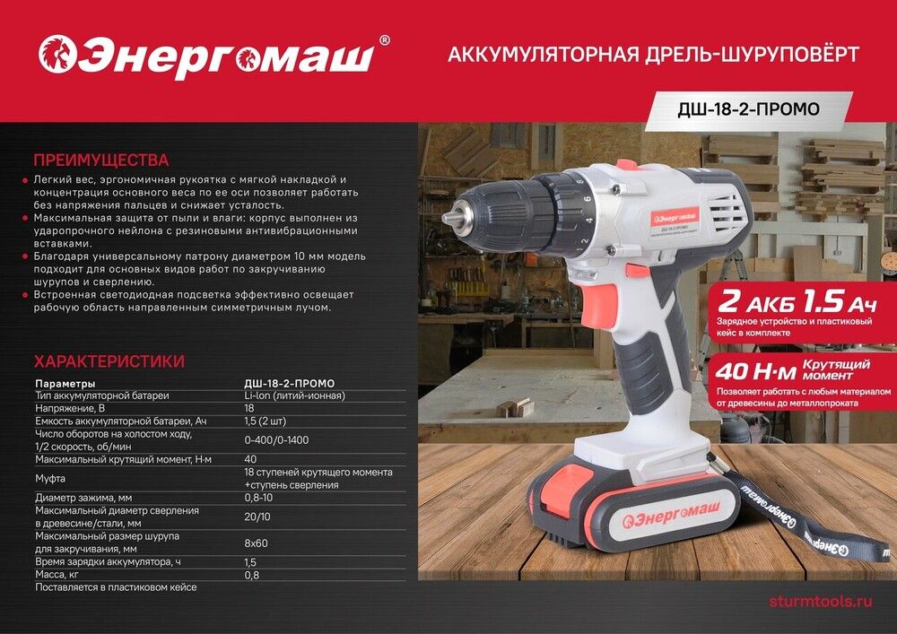 Читать все статьиАккумуляторный шуруповерт Энергомаш ДШ-18-2-ПРОМО