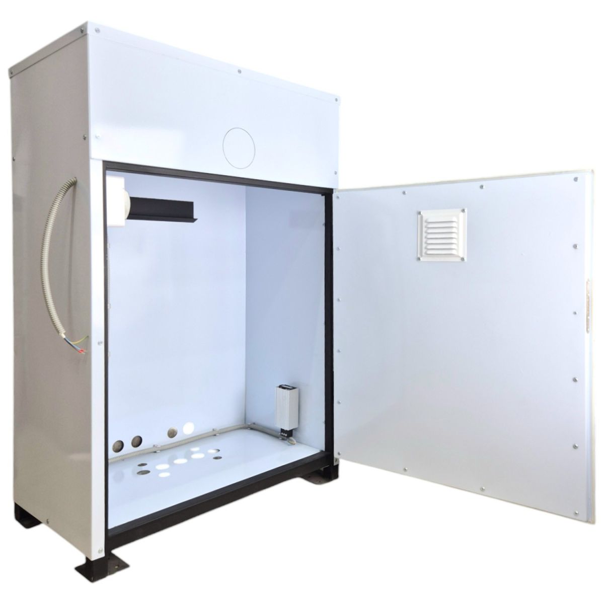 Термобокс оснащен электрическим теном и термостатом мониторинга температуры внутри. Бокс изготовлен из специальных Сендвич панелей с утеплением 40 мм, предназначен для эксплуатации в условиях умеренного климата в соответствии с условиями умеренного и холодного климатов при предельной рабочей температуре от +40 до -40 градусов.