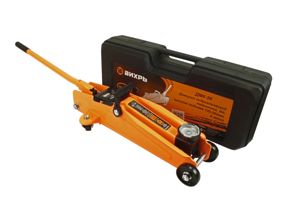 Домкрат гидравлический подкатной предназначен для поднятия автомобилей при шиномонтаже и ремонте. В целях безопасности все домкраты Вихрь оснащены защитой от перегрузки, которая не позволяет поднимать массу, превышающую допустимый максимум. Поставляется в кейсе.Максимально допустимая масса 2 тонны, высота подхвата 135 мм, высота подъёма 385 мм. Поставляется в кейсе.