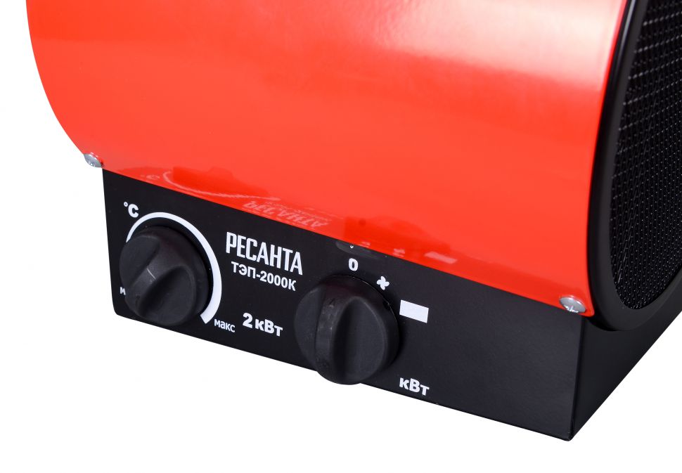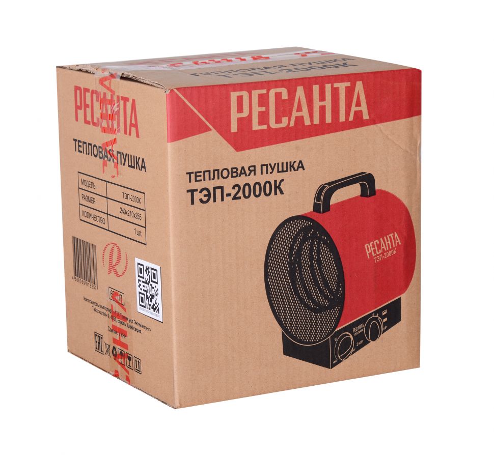 Тепловая электрическая пушка РЕСАНТА ТЭП-2000К предназначена для вентиляции и обогрева жилых и производственных помещений, складов, гаражей, а также для обогрева и сушки в строительстве. Прибор относится к тепловым пушкам круглого типа. Нагревательный элемент - трубчатый. Данная модель рассчитана на питание от электросети переменного тока частотой 50 Гц, номинальным напряжением 220-230В (однофазная). Устанавливается на полу.Обогреватель оснащен регулировкой режимов работы (мощности): Режим 1: 30 Вт (в этом режиме работает только вентилятор. Функция обогрева отключена) Режим 2: 2000 Вт Функциональные особенности: Терморегулятор – предназначен для регулировки температуры; Регулировка режимов работы – данная регулировка предназначена для выбора режимов работы; Режим выключения – данная функция предназначена для отключения режимов работы; Режим вентилятора – данная функция предназначена для включения вентилятора, а также применяется на 10-15 секунд перед отключением устройства для охлаждения тэнов; Режим работы на 100% мощности – данная функция позволяет включить вентиляцию с включением всех нагревательных элементов.Важно: не накрывать и не ставить тепловую пушку на ковровые покрытия. Помещения должны быть сухими, с температурой от минус 10 до плюс 40°С.Комплектация: Электрическая пушка — 1 шт. Руководство по эксплуатации — 1 шт. Упаковка — 1 шт.