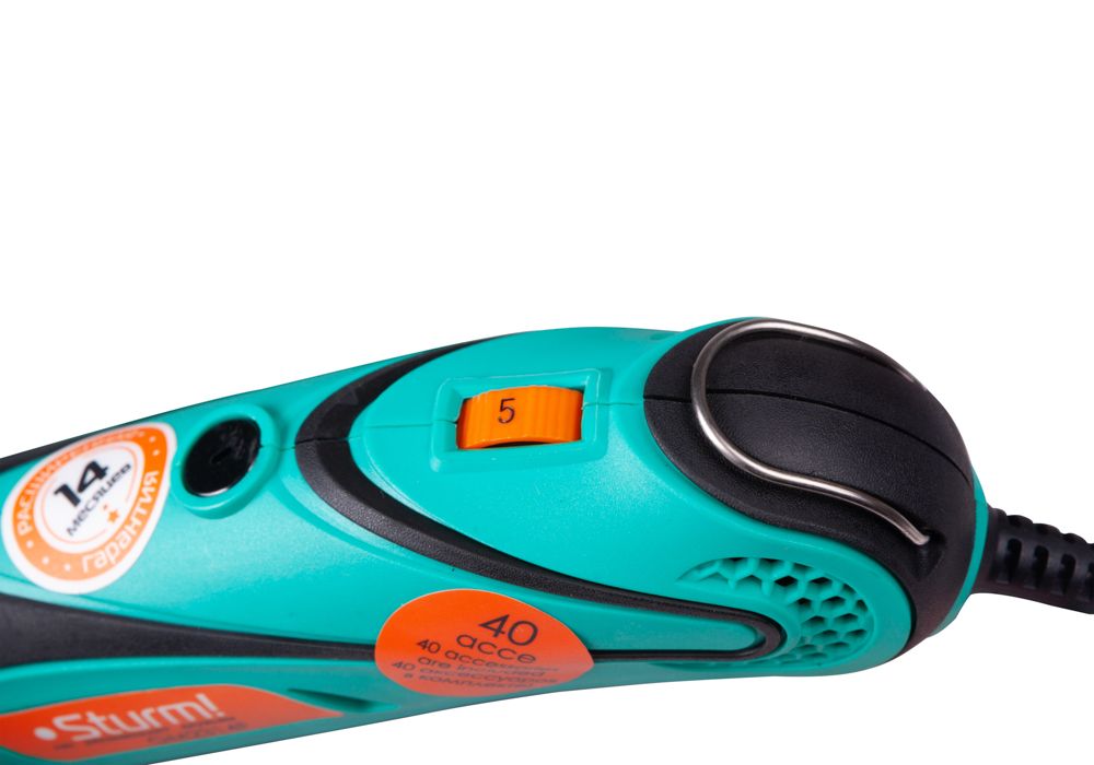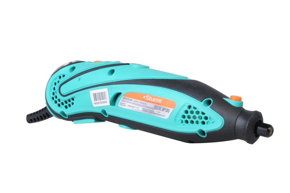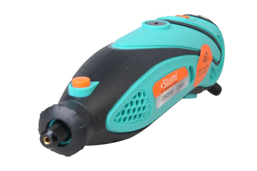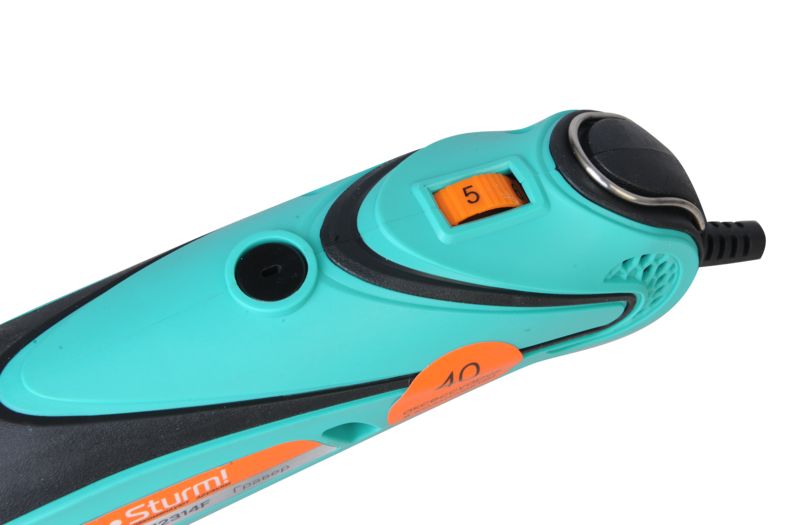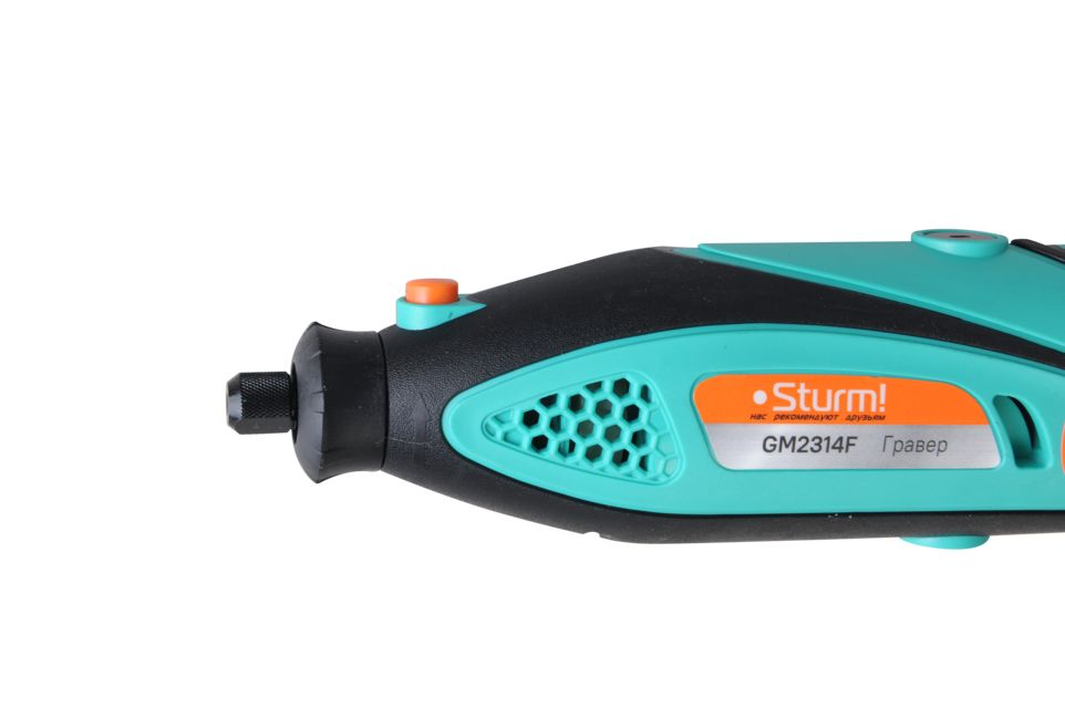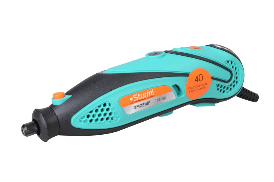 Sturm GM2314F - универсальный электрический гравер. Предназначен для выполнения различных мелких и точных работ: гравировки, шлифовки, полировки, сверления и резки. Инструмент имеет небольшие массогабаритные показатели, а также отличную эргономику ¬– все это способствует лучшему контролю рабочего процесса и надежности хвата. Благодаря гибкому валу значительно упрощается проведение работ в стесненных условиях и труднодоступных местах, а наличие на корпусе металлической скобы дает возможность подвесить гравер в любом удобном месте, тем самым, повышая комфорт использования. Модель оснащена функцией регулировки оборотов в широком диапазоне от 10000 до 32000 об / мин и позволяет выбрать оптимальный технологический режим для конкретного вида материала и оснастки. Система крепления насадок с использованием двух типовых диаметров (2.4 и 3.2 мм) фиксирующей цанги облегчает подбор оснастки и значительно расширяет диапазон применения устройства. Для легкой и удобной замены оснастки предусмотрена возможность блокировки вала шпинделя. Наличие функции быстрого доступа к щеткам позволяет проводить их замену без необходимости разборки корпуса инструмента. В комплекте с инструментом поставляется расширенный набор оснастки из 40 аксессуаров, а также гибкий вал и прочный пластиковый кейс. Назначение: для выполнения различных мелких и точных работ: гравировки, шлифовки, полировки, сверления и резки.