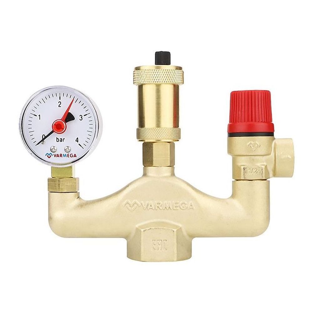 Группа безопасности котла Varmega применяется в закрытых системах водяного отопления для защиты от превышения максимально допустимого рабочего давления и отвода воздуха. Она состоит из предохранительного клапана, автоматического воздухоотводчика с запорным клапаном и манометра, смонтированных на общем основании – консоли из оцинкованной стали. Группу безопасности необходимо устанавливать строго вертикально в любой точке системы отопления выше котла, при этом, желательно, осуществлять установку в месте с минимально возможной температурой. На участке трубопровода от котла до группы безопасности запрещается установка запорной арматуры, фильтров и других элементов, которые могут уменьшить его проходное сечение.