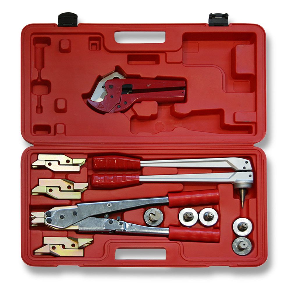 Расширитель, набор расширительных головок, запрессовщик, набор насадок, ножницы для резки пластиковых труб, кейс.