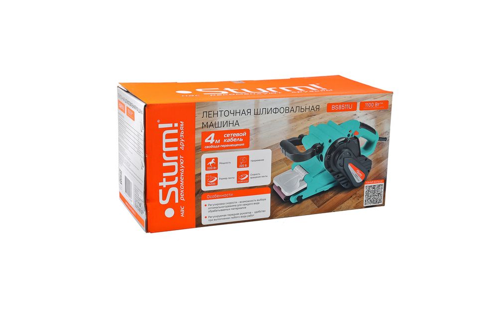 Sturm BS8511U – универсальная и производительная ленточная шлифовальная машина, рассчитанная под использование шлифовальной ленты размерностью 76х533 мм – предназначена для грубого и чистового шлифования плоских и выпуклых поверхностей, в том числе значительных по площади. Важная конструктивная отличительная особенность Sturm BS8511U от аналогов – разный размер опорных роликов: диаметр переднего ролика значительно меньше диаметра заднего – цель данного решения – сокращение до минимума мертвой зоны при обработке вплотную к препятствиям. Передняя крышка корпуса выполнена откидной, что способствует лучшему доступу в узких местах. Шлифмашина оснащена мощным 1100 Вт электромотором, позволяющим развивать значительную скорость вращения ленты, тем самым обеспечивая высокую производительность, а также качество работы: заложенный запас мощности способствует ровному поступательному ведению инструмента и эффективной обработке материалов с повышенными требованиями по качеству. За счет функции электронной регулировки оборотов, скорость движения ленты варьируется в широком диапазоне от 120 до 380 м / мин – это позволяет уверенно обрабатывать не только деревянные поверхности, но также металл и пластик. Для максимальной простоты эксплуатации модель получила функцию автоматического центрирования, благодаря которой шлифовальная лента после включения машины позиционируется точно по центру и удерживается в правильном рабочем положении. При необходимости, донастройка ленты может также производиться с помощью специального регулировочного винта. Предусмотренная конструкцией система крепления шлифовальной ленты с помощью зажимного рычага значительно экономит время, необходимое для замены оснастки. Также, легкости обслуживания инструмента способствует наличие функции быстрого доступа к щеткам, позволяющей производить их замену без демонтажа элементов корпуса. Назначение: для грубого и чистового шлифования плоских и выпуклых поверхностей.