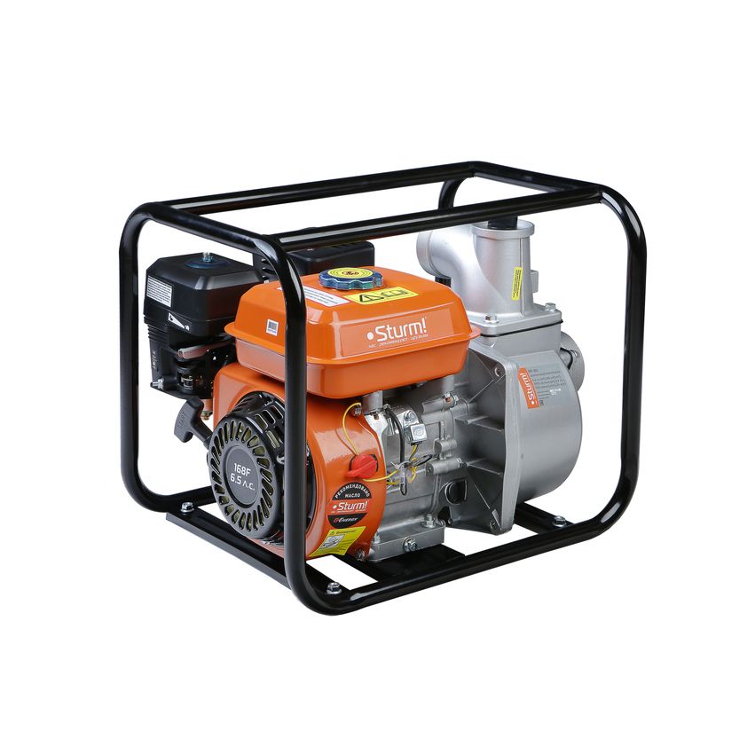 Sturm BP-80 – высокопроизводительная универсальная бензиновая мотопомпа для домашнего, жилищно-коммунального или строительного применения. Имеет классическую компоновку: двигатель и насос смонтированы внутри прочной усиленной трубчатой рамы, страхующей основные узлы от случайных повреждений, при транспортировке. Мотопомпа оснащается четырехтактным бензиновым двигателем рабочим объемом 196 см3 (мощность 5 кВт / 6,5 л. с.) с верхним расположением клапанов (OHV) и воздушным охлаждением. Благодаря ряду технических решений: коленчатому валу повышенной прочности и усиленной цилиндро-поршневой группе, силовой агрегат надежен и неприхотлив в использовании. На модели Sturm BP-80 установлен самовсасывающий насос центробежного типа, обеспечивающий высокую максимальную производительность 1100 л / мин – один из лучших показателей среди мотопомп аналогичной мощности. Агрегат способен осуществлять забор жидкости с глубины до 8 метров, что позволяет выкачивать воду из достаточно глубокого колодца или скважины, и демонстрирует высоту подъема (напор) жидкости – 30 метра. Модель проста в обслуживании и эксплуатации и не требует от пользователя каких-либо специальных навыков. Рекомендуемое топливо – бензин АИ-92. Запуск агрегата производится с помощью ручного стартера. Назначение: для перекачки чистой воды в больших объемах. Используется для: - полива сельхозугодий и садовых участков, - водоснабжения из колодцев, скважин и водоёмов, - перекачки чистой воды между ёмкостями, - осушения бассейнов, затопленных помещений и траншей.
