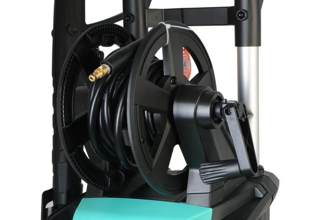 мойка, шланг высокого давления на барабане, пистолет распылитель, распыляющая трубка с веерной насадкой, распыляющая трубка с роторной насадкой, крюк для электрокабеля, держатель для пистолета-распылителя, игла для чистки распыляющего сопла, впускно