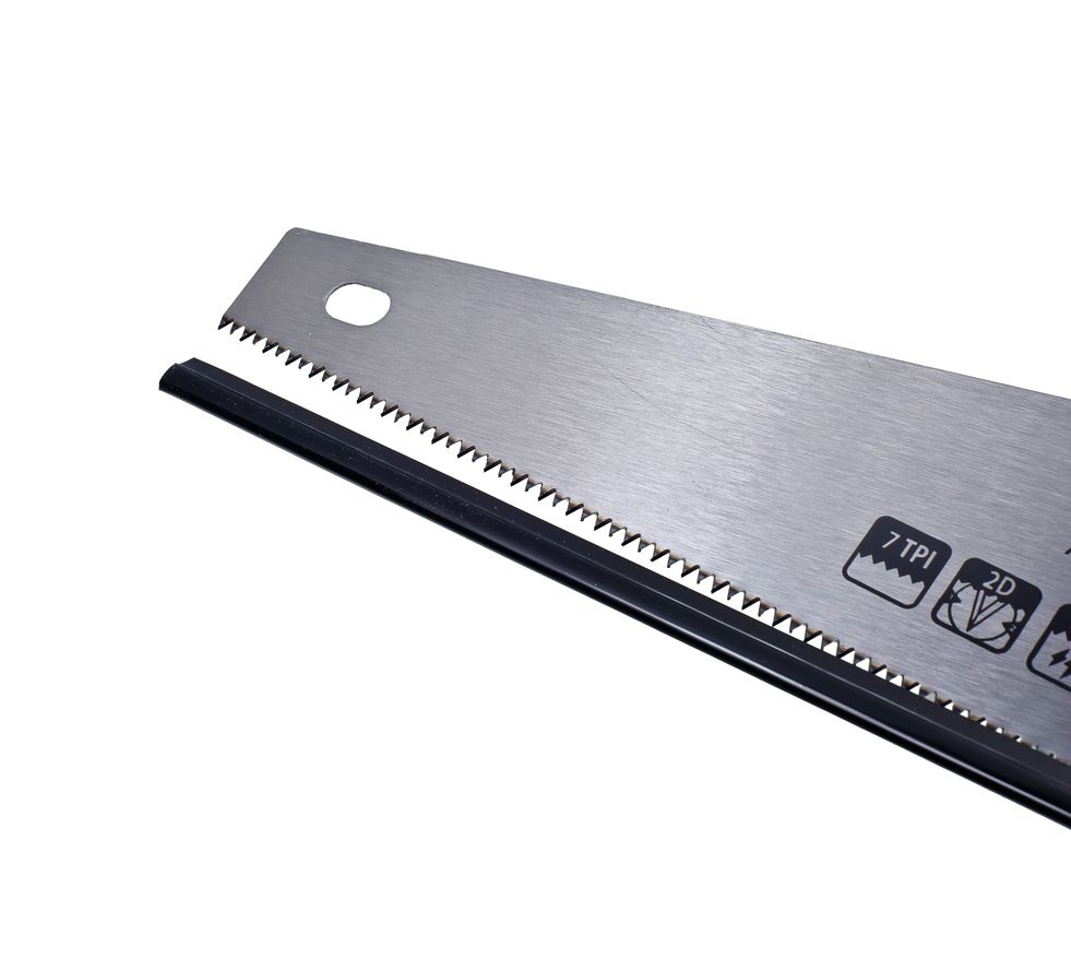 Двухгранная алмазная заточка снижает трение и увеличивает скорость распила. Закалённый до 60HRC зуб длительное время сохраняет свою заточку. Антикоррозийное полимерное покрытие защищает полотно от воздействия влаги. Эргономичная обрезиненная рукоятка плотно лежит в руке, что улучшает контроль инструмента. Пластиковый защитный кожух защищает от случайных порезов.