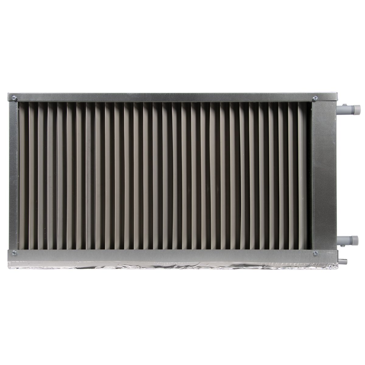 Теплообменник выполнен из медных труб с алюминиевым оребрением. Стандартно имеет трехрядное исполнение. Шаг оребрения составляет 2,1 мм (вместо общепринятого для наборных систем вентиляции 2,5 мм). Уменьшенный шаг позволяет существенно увеличить теплоотдачу и оптимизировать массогабаритные показатели при незначительном увеличении аэродинамического сопротивления теплообменника. Для увеличения теплоотдачи трубы механически расширены и тем самым жестко соединены с оребрением. Пайка калачей теплообменника осуществляется припоем с 2 % содержанием серебра, что обеспечивает высокое качество паяных деталей.