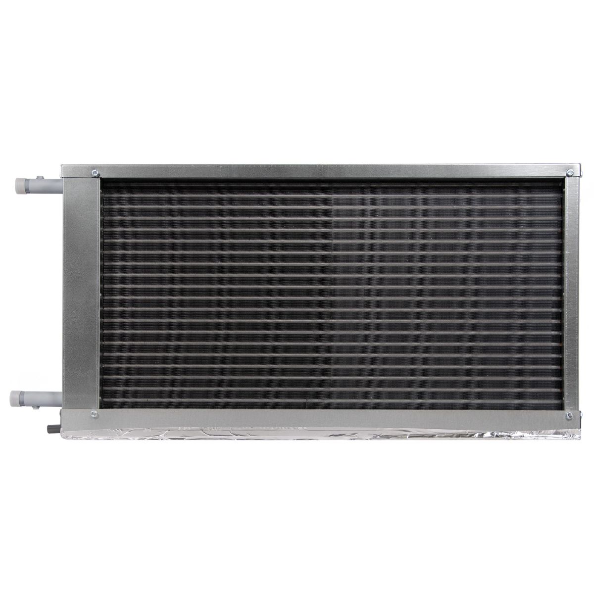 Теплообменник выполнен из медных труб с алюминиевым оребрением. Стандартно имеет трехрядное исполнение. Шаг оребрения составляет 2,1 мм (вместо общепринятого для наборных систем вентиляции 2,5 мм). Уменьшенный шаг позволяет существенно увеличить теплоотдачу и оптимизировать массогабаритные показатели при незначительном увеличении аэродинамического сопротивления теплообменника. Для увеличения теплоотдачи трубы механически расширены и тем самым жестко соединены с оребрением. Пайка калачей теплообменника осуществляется припоем с 2 % содержанием серебра, что обеспечивает высокое качество паяных деталей.