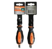 Отвертки имеют эргономичную двухкомпонентную рукоятку с рифлениями, исключающими проскальзывание, мягкая поверхность рукоятки делает работу комфортной. Рабочая часть выполнена из качественной инструментальной стали, что определяет ее прочность и износостойкость. Жало отвертки намагничено для удержания метизов при работе.