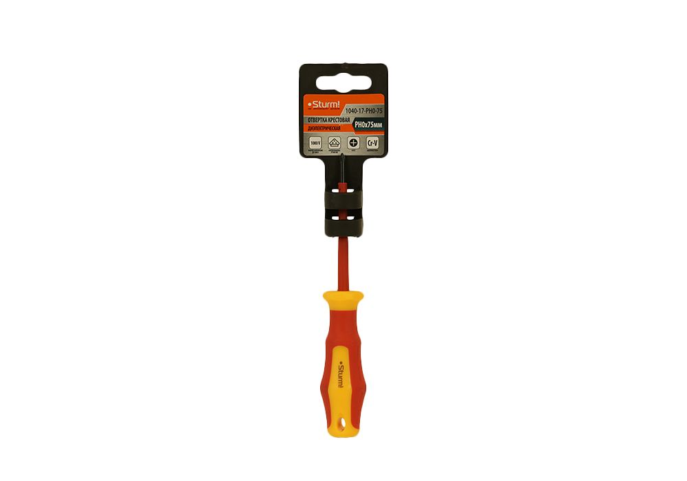 Отвертка Sturm! 1040-17-PH0-75 с многокомпонентной ручкой эргономичной ручкой. Отвертка для безопасной работы на оборудовании с максимально допустимым напряжением 1000 В. Многогранный край ручки для защиты от перекатывания отвёртки на рабочем месте.