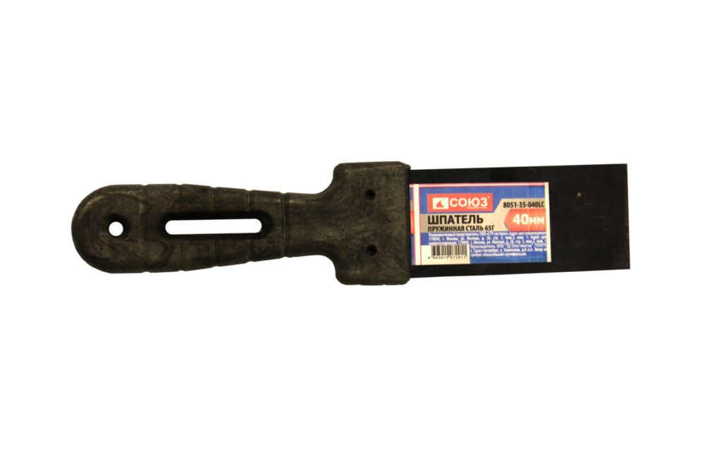8051-35-040LC Шпатель, 40мм, пружинная колор сталь 65Г, пластиковая рукоятка, СОЮЗ Шпатели с пластиковой ручкой СОЮЗ используются для нанесения и разравнивания шпатлёвки, очистки поверхностей от старой замазки, обоев, краски, выполнения мелких отделочных работ, например, замазывания меж плиточных швов или затирки небольших поверхностей. Инструмент прослужит долгие годы без поломок, подходит для частого использования. Для надежности лезвие выполнено из углеродистой колоризованной пружинной стали. Для удобства хранения у пластиковой ручки имеется отверстие для подвеса.