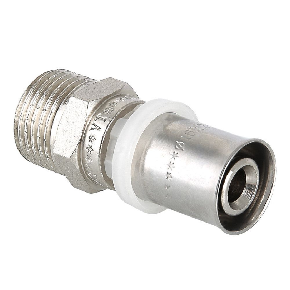 Соединитель, пресс с переходом на наружную резьбу 26х1" Valtec VTm.201.N.002606 - специализированный фитинг для соединения металлопластиковой или РЕХ-трубой и перехода на трубную резьбу элемента системы (крана, клапана и т. д.).