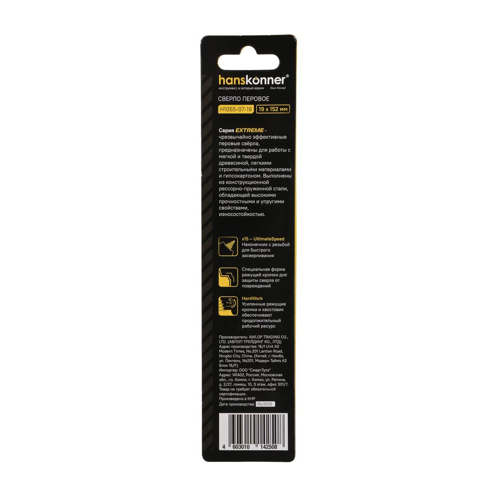 Читать все статьиСверло перовое по дереву 19мм, высококачеств. сталь, шестигр. хвостовик, Hanskonner