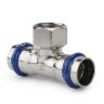 Тройник с внутренней резьбой Varmega Inox Press с двух сторон имеет раструбное соединение для труб, а с третьей стороны фитинга находится внутреннее резьбовое соединение. Данный фитинг позволяет присоединить к трубопроводу различные резьбовые элементы (краны, фильтры и т. п.), также дает возможность подключиться к другому типу трубопровода. Для получения надежного неразъемного соединения трубы и фитинга потребуется специальный пресс-инструмент с насадками типа профиль «V».