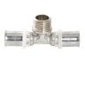 Пресс-фитинг – тройник с переходом на наружную резьбу предназначен для подсоединения к металлопластиковым (металлополимерным) трубам или трубам из сшитого полиэтилена элемента системы с внутренней резьбой. Резьба фитинга – трубная по ГОСТу 6357.