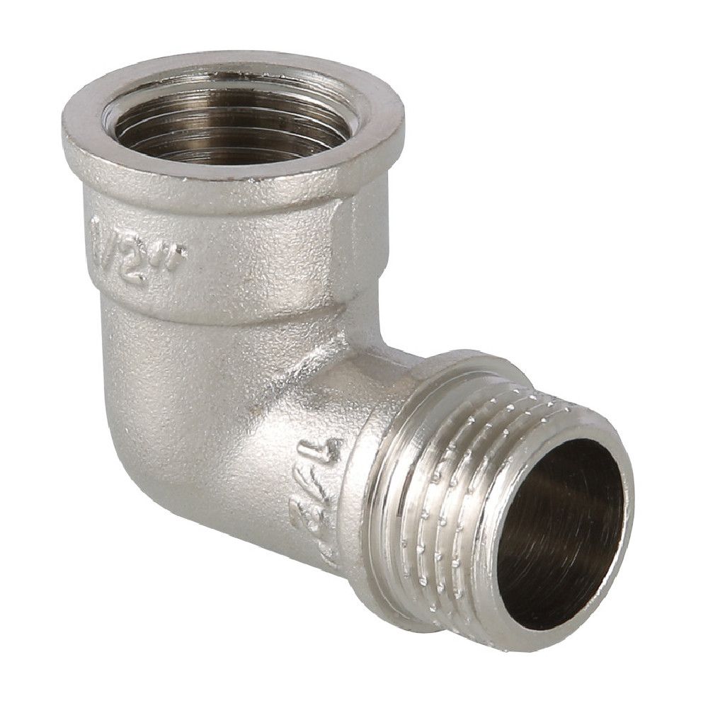 Угольник VALTEC для монтажа трубопроводов с поворотом на 90°. Резьба внутренняя-наружная 1 1/4". Изготовлен из латуни с никелевым покрытием. Применяется в системах водоснабжения и отопления.