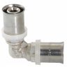 Пресс-фитинг - угольник, обеспечивающий соединение труб (металлопластиковых или из сшитого полиэтилена) под углом 90 градусов. Особенности конструкции изделия, используемые материалы обусловили надежность соединений, повышенную пропускную способность, температурную стойкость, механическую прочность. При изготовлении пресс-угольника используются высококачественные материалы: сантехническая латуни CW617N с никелевым покрытием (корпус), нержавеющая сталь (гильза), EPDM (уплотнительные кольца, 2 шт. для каждого штуцера). Фиксатор, одновременно играющий роль диэлектрической прокладки, делается из нейлона. Монтаж соединителя выполняется пресс-инструментом с насадкой ТН.