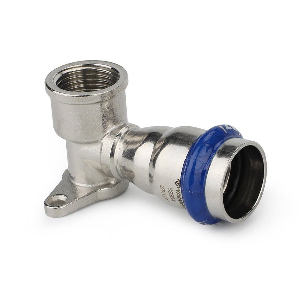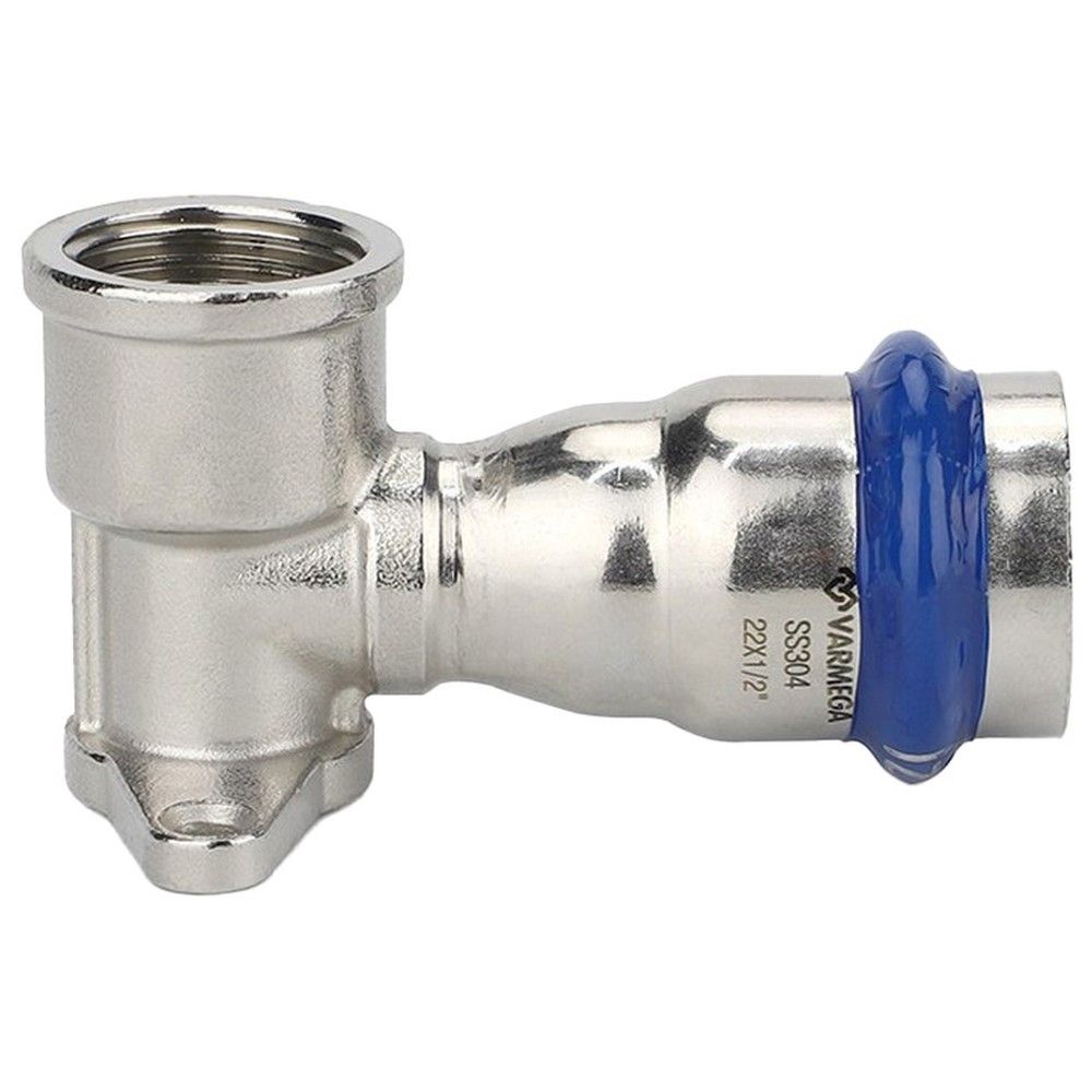 Угольник с внутренней резьбой Varmega Inox Press с одной стороны имеет раструбное соединение для трубы, а с другой стороны фитинга находится внутреннее резьбовое соединение. Особенностью данного фитинга является наличие настенных креплений, которые позволяют зафиксировать угольник под ровным углом. Для получения надежного неразъемного соединения трубы и фитинга потребуется специальный пресс-инструмент с насадками типа профиль «V».